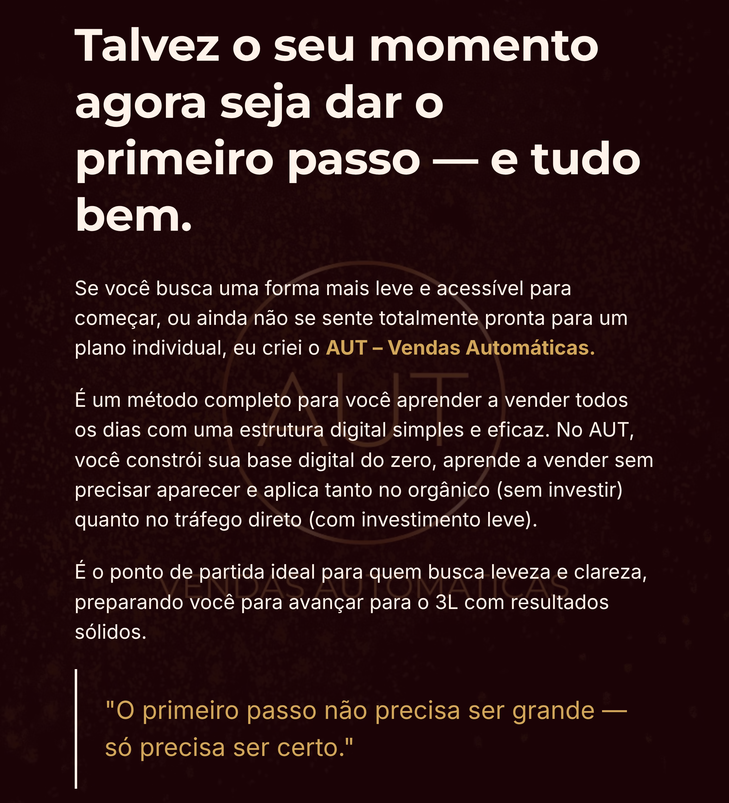 O 3L pode sim ser o seu primeiro passo — desde que você esteja pronta pra aplicar. Eu te mostro como construir sua estrutura do zero, com clareza e leveza, e crio um plano feito sob medida pra sua rotina e realidade atual. Se você ainda está totalmente no início e quer algo mais rápido e acessível, o AUT – Vendas Automáticas pode ser o melhor ponto de partida (também criado por mim).
