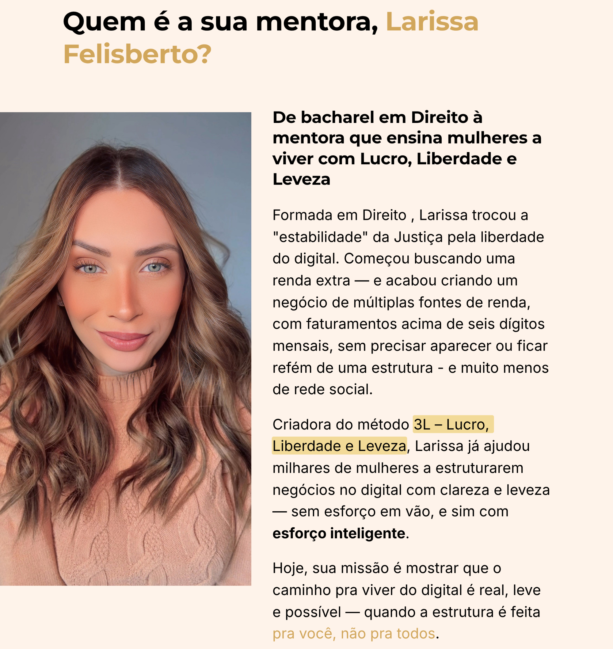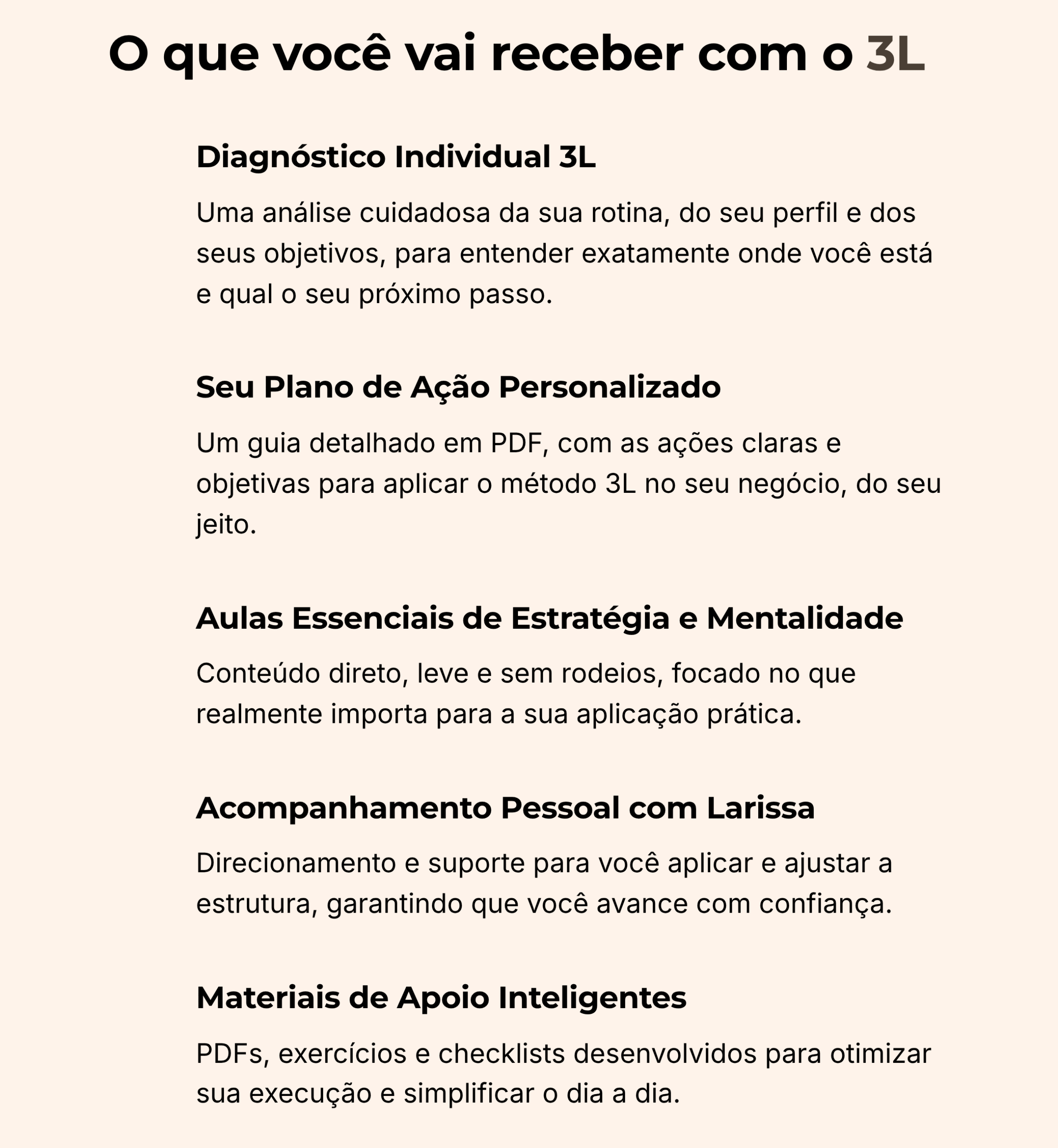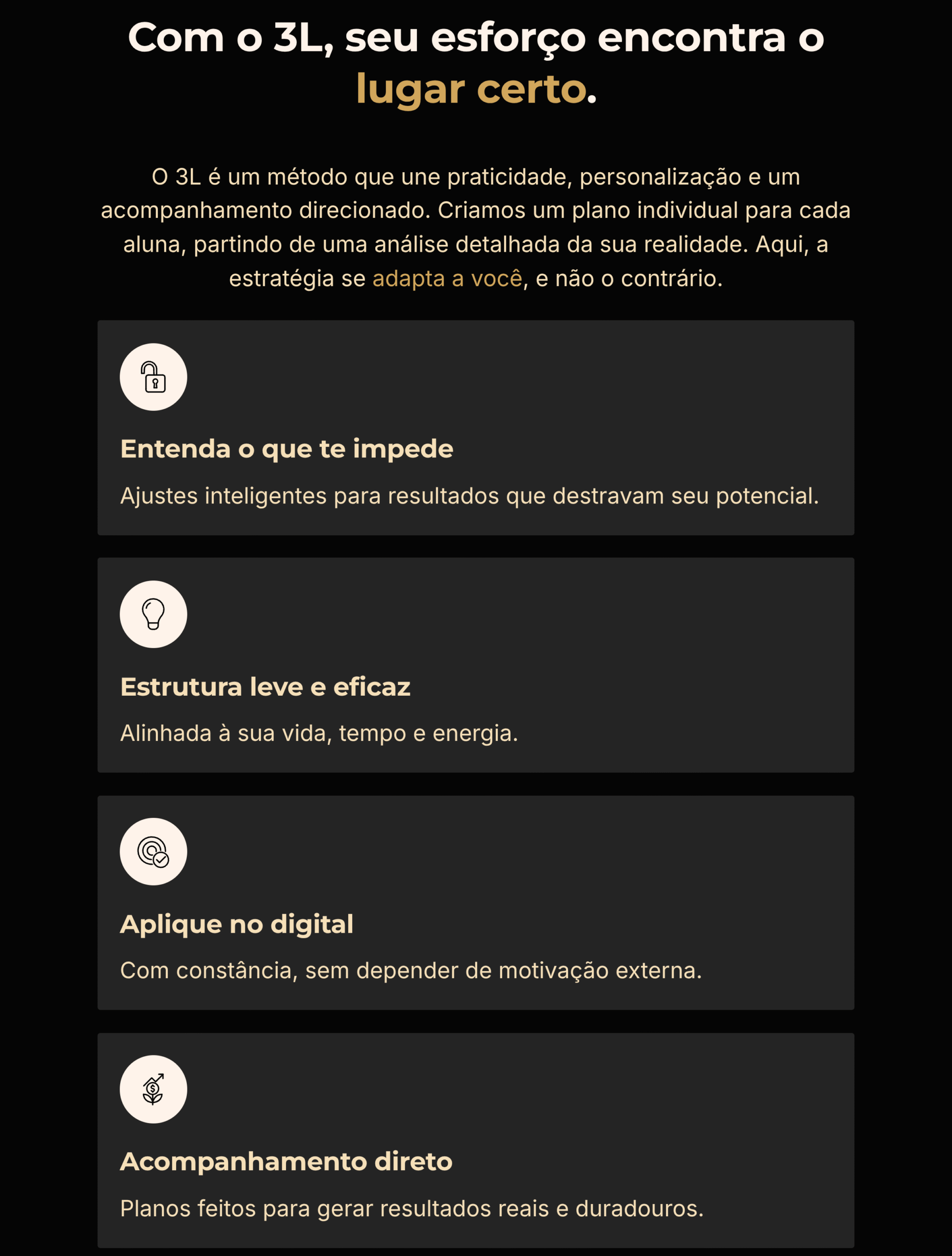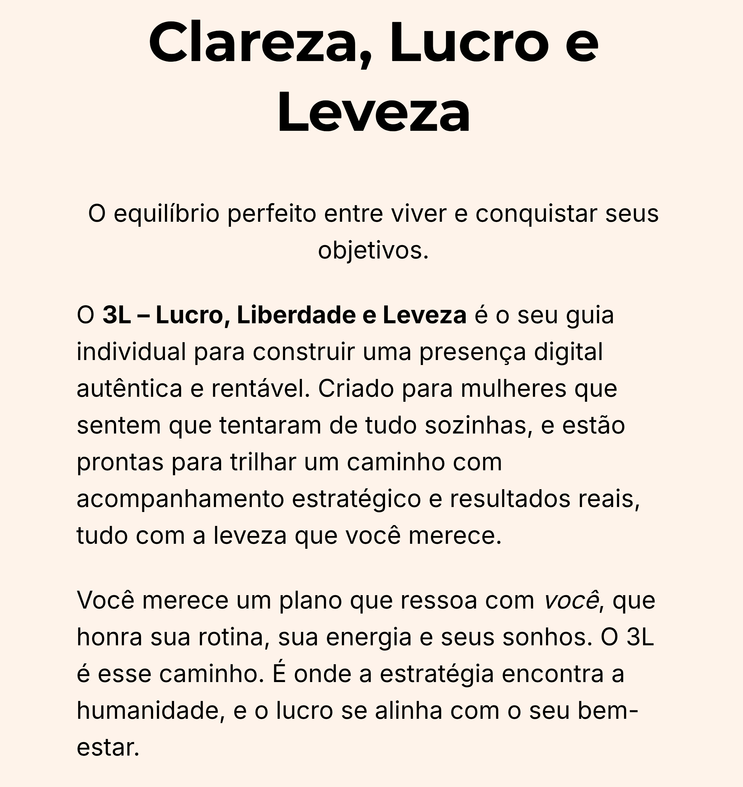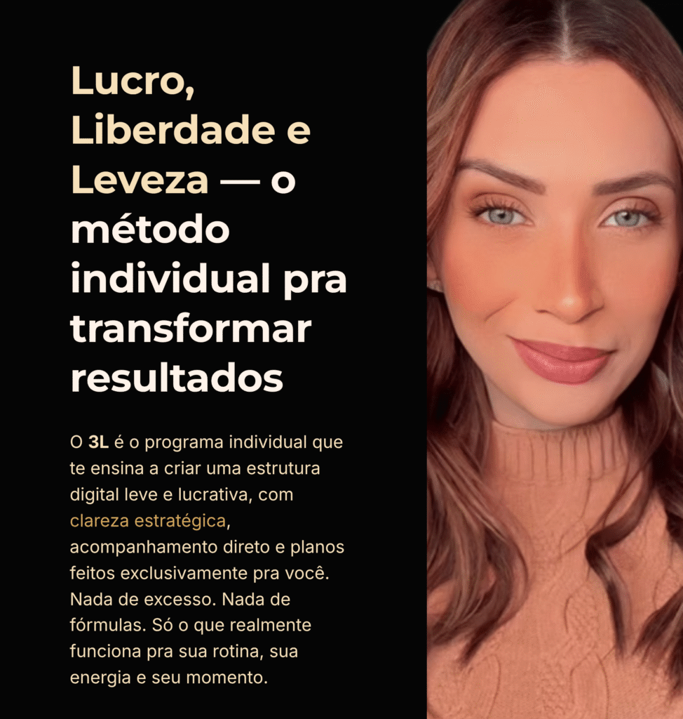Sim — completamente. O 3L não te entrega “mais conteúdo”, ele te entrega clareza e estrutura, o que é completamente diferente. Você não vai assistir e sair perdida. Você vai aplicar um passo a passo feito pra você e ver sentido. O foco é o esforço inteligente, e eu te acompanho de perto pra garantir isso.