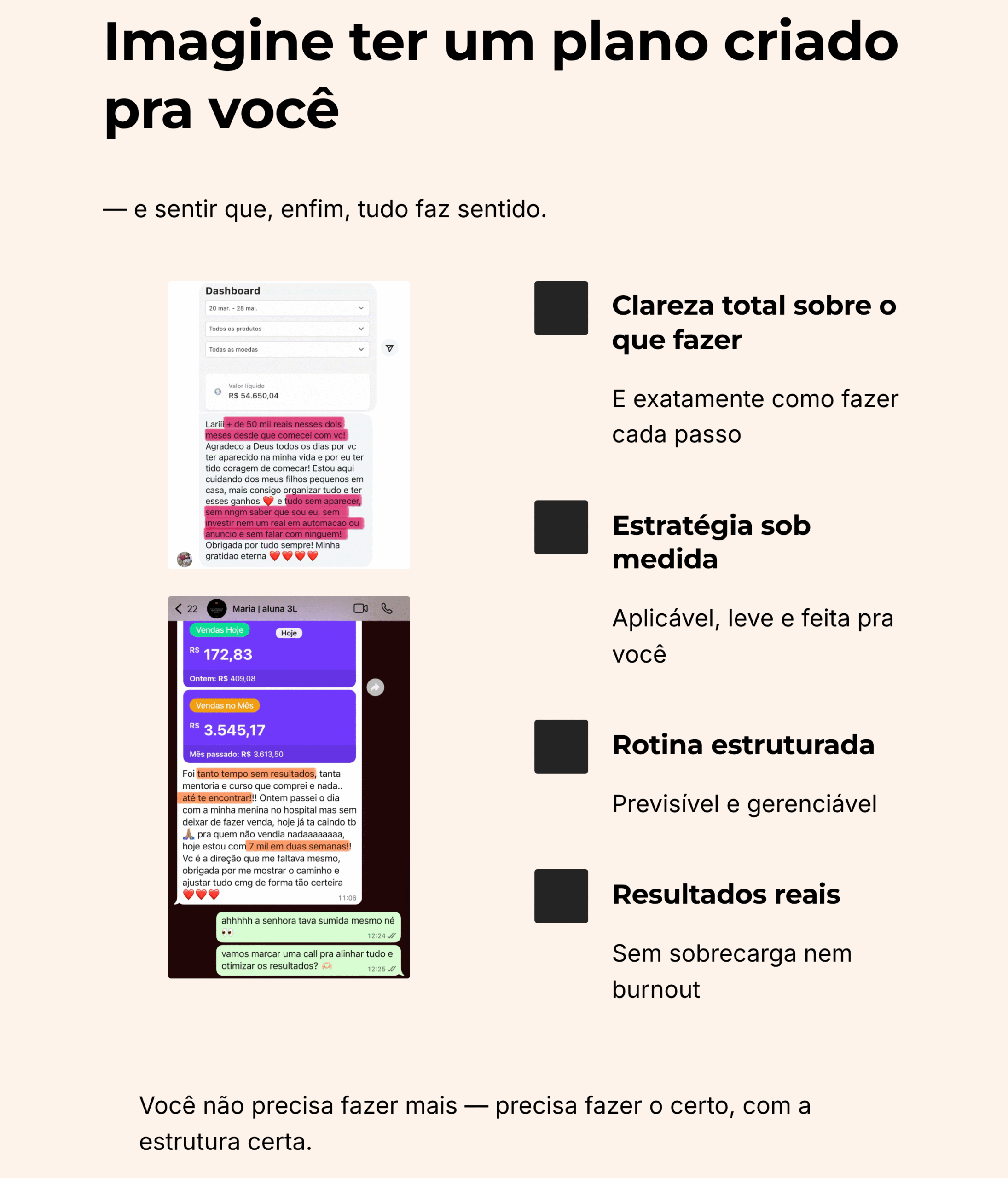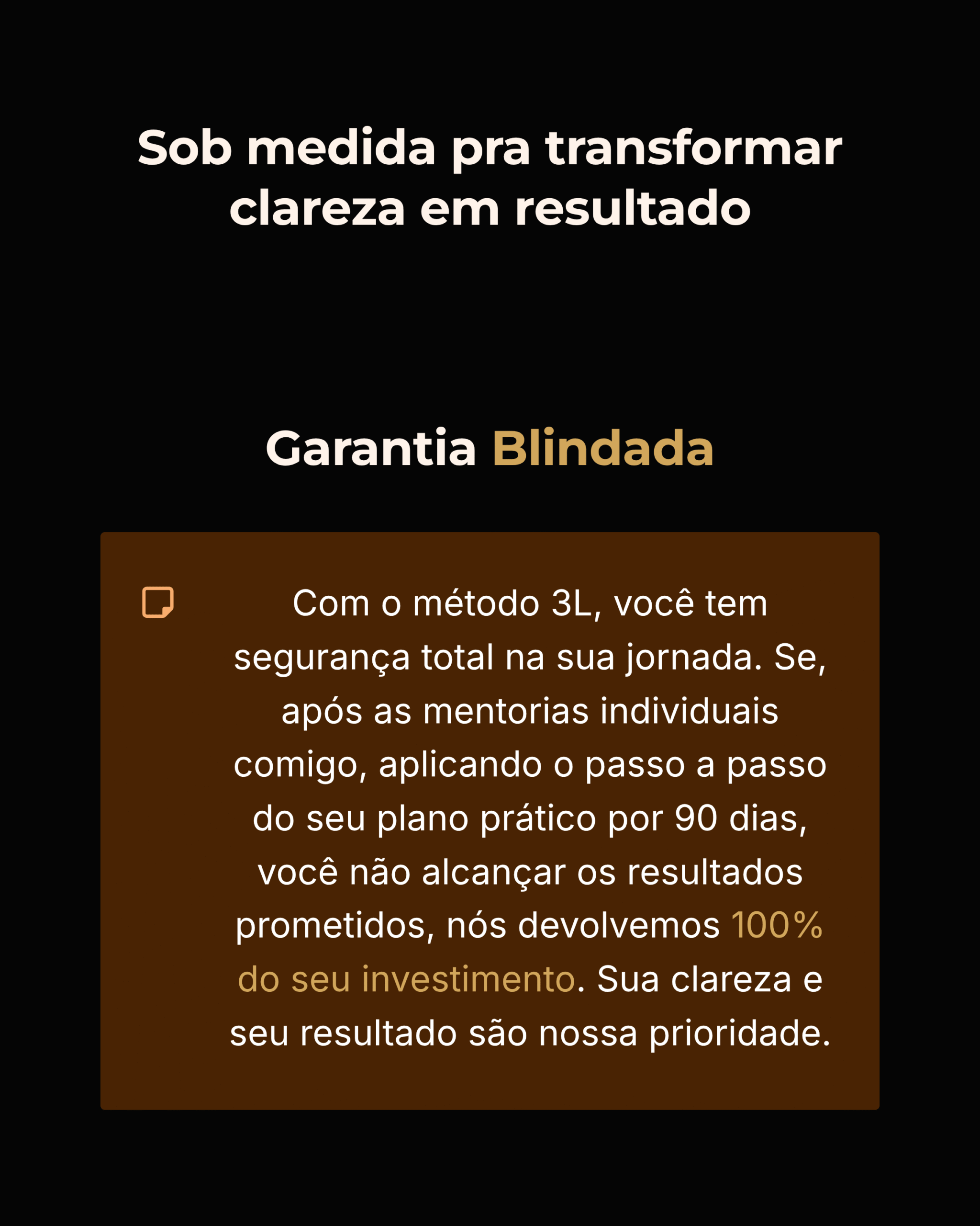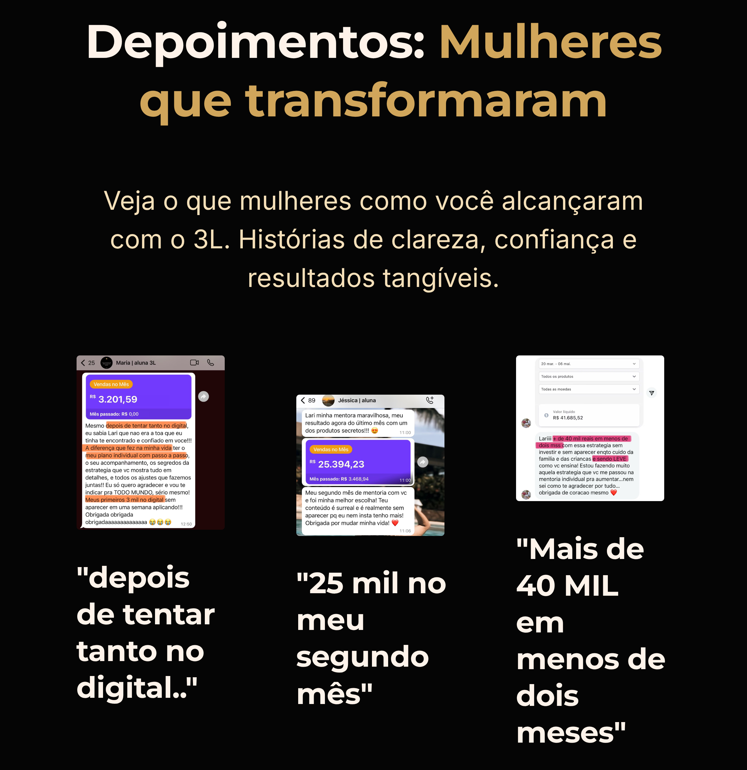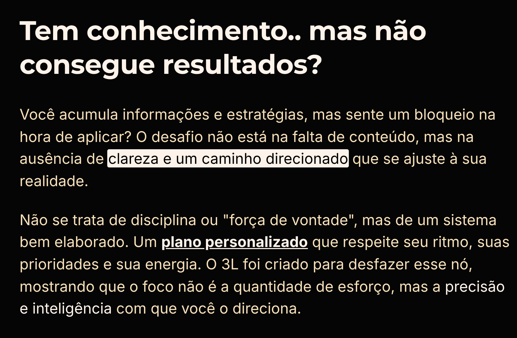 Sim — completamente. O 3L não te entrega “mais conteúdo”, ele te entrega clareza e estrutura, o que é completamente diferente. Você não vai assistir e sair perdida. Você vai aplicar um passo a passo feito pra você e ver sentido. O foco é o esforço inteligente, e eu te acompanho de perto pra garantir isso.