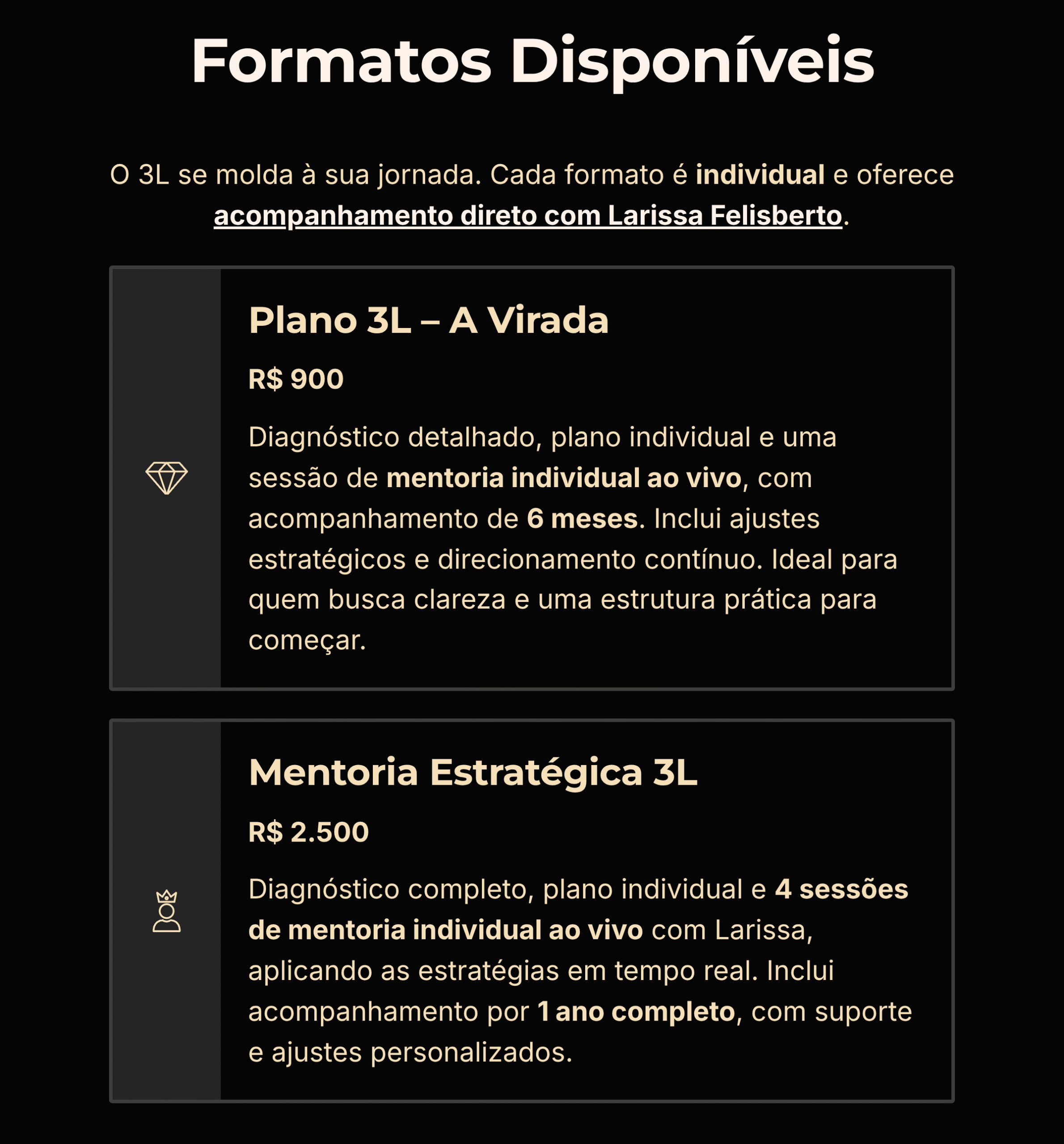 O Plano 3L (R$900) inclui seu diagnóstico individual, um plano personalizado em PDF, e acompanhamento direto comigo por 4 meses. Já a Mentoria Estratégica 3L (R$2500) é um processo ao vivo e individual comigo, onde aplicamos tudo juntas na tela — com acompanhamento durante 1 ano completo, ajustes cirúrgicos e evolução contínua. O Plano é o seu mapa. A Mentoria é o caminho percorrido com minha supervisão e direcionamento direto.